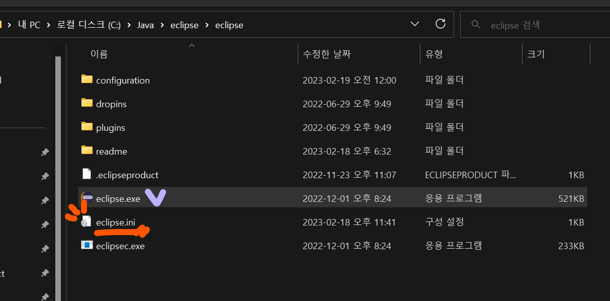 이동을 완료 하셨으면 eclipse.exe 파일 아래에 eclipse.ini를 찾고 파일을 열어주세요.
