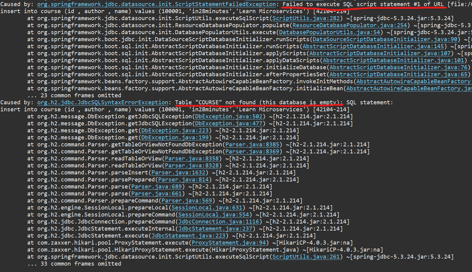 오류1 : Failed to exeute SQL script statemnt #1 of URL