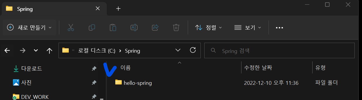 저는 C드라이브에 Spring이라는 폴더를 생성한 후 압축을 풀어줬습니다.