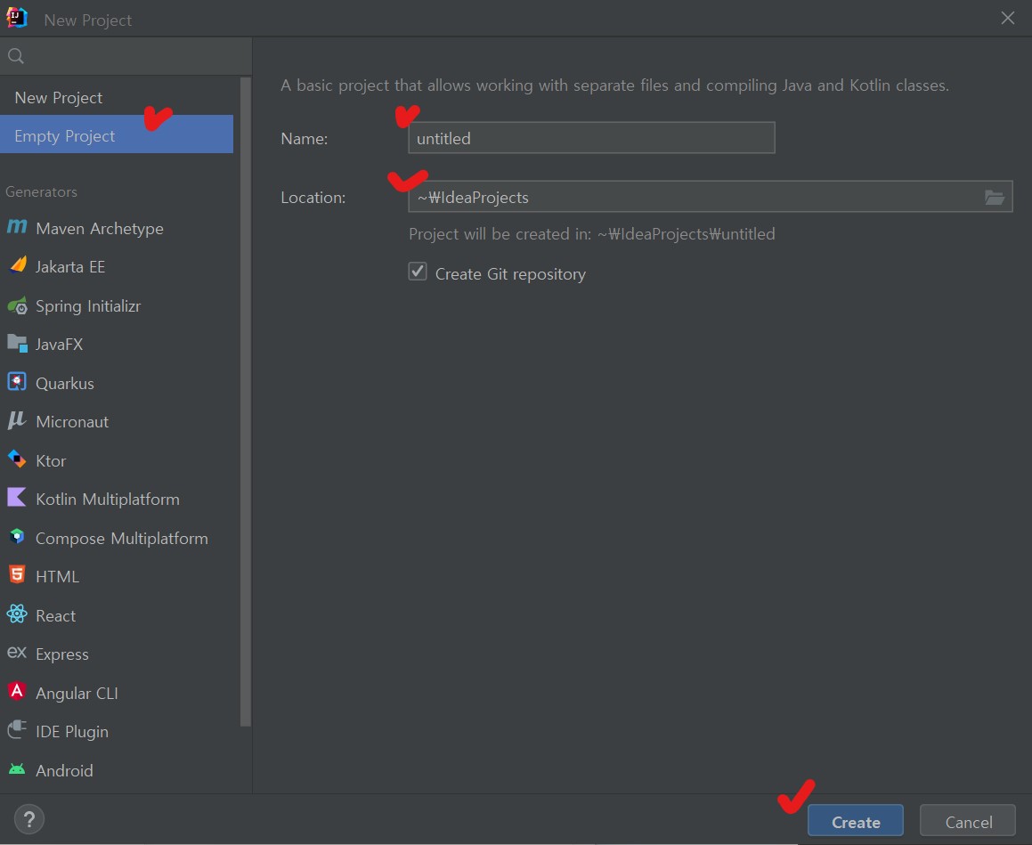 Project를 생성하는 방법과 여러 순서가 있지만 저는 다음과 같이 진행할 예정입니다.