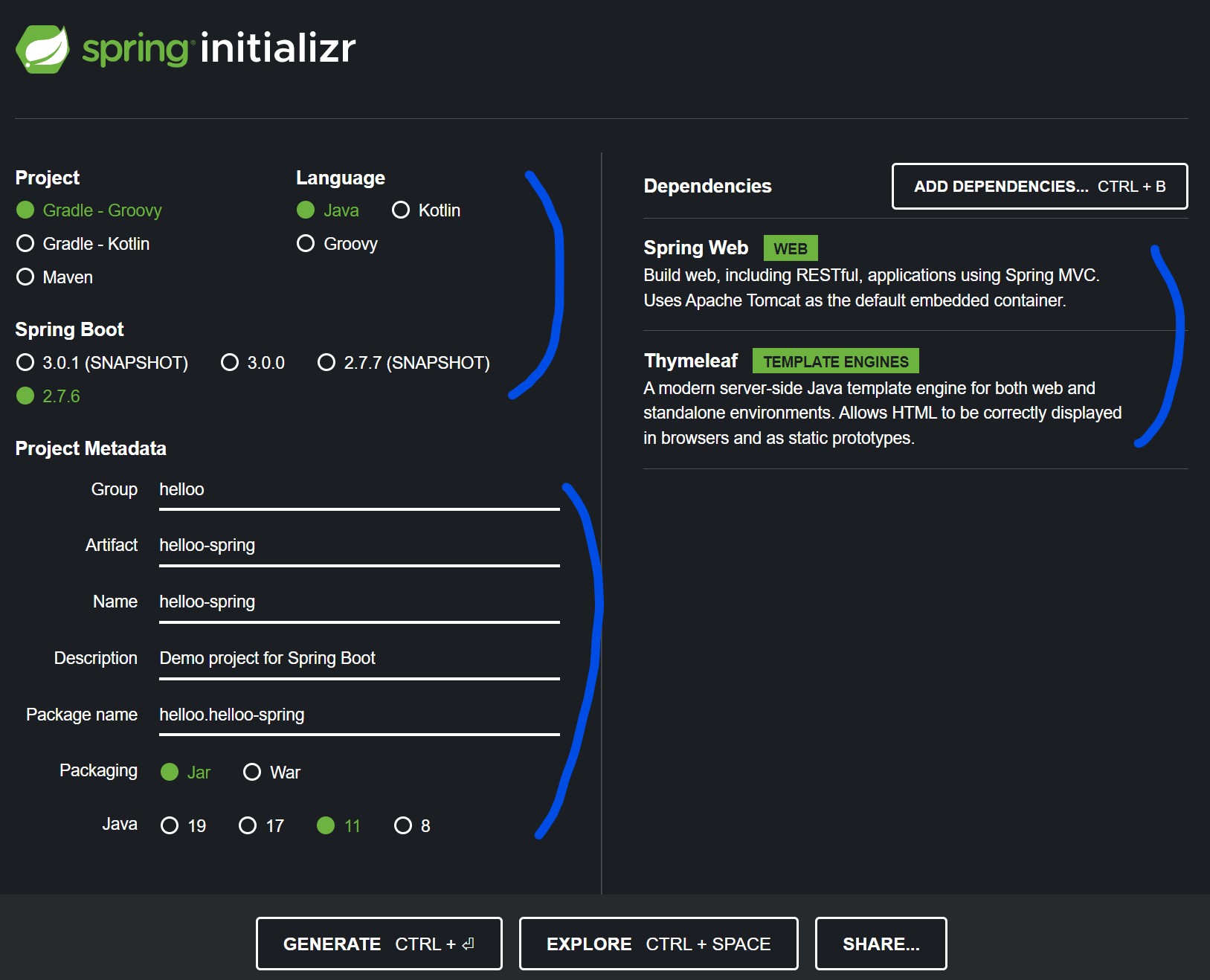 - Dependencies : 프로젝트에서 사용할 라이브러리를 선택합니다.