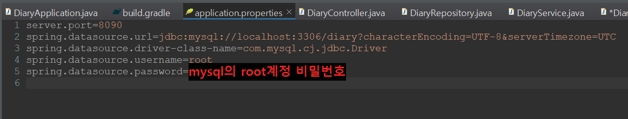 spring.datasource.url=jdbc:mysql://localhost:3306/diary?characterEncoding=UTF-8&serverTimezone=UTC