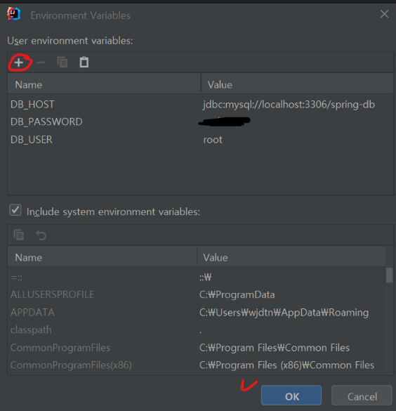 ex ) DB_HOST=jdbc:mysql://localhost:3306/spring-db;DB_PASSWORD=1234;DB_USER=root