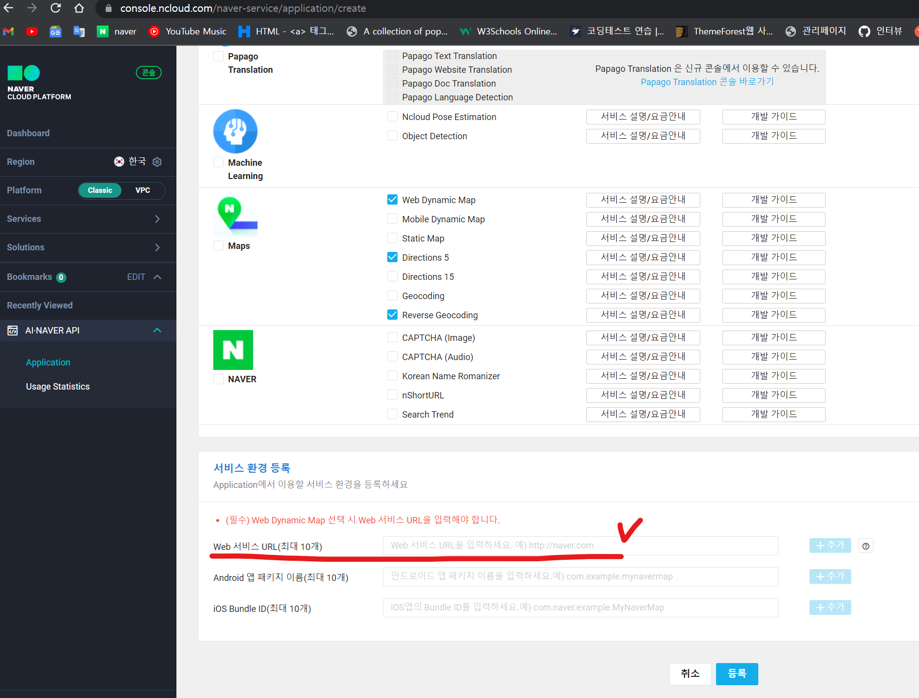 사용할 서비스를 선택하고 , 서비스 환경 등록을 해줍니다.