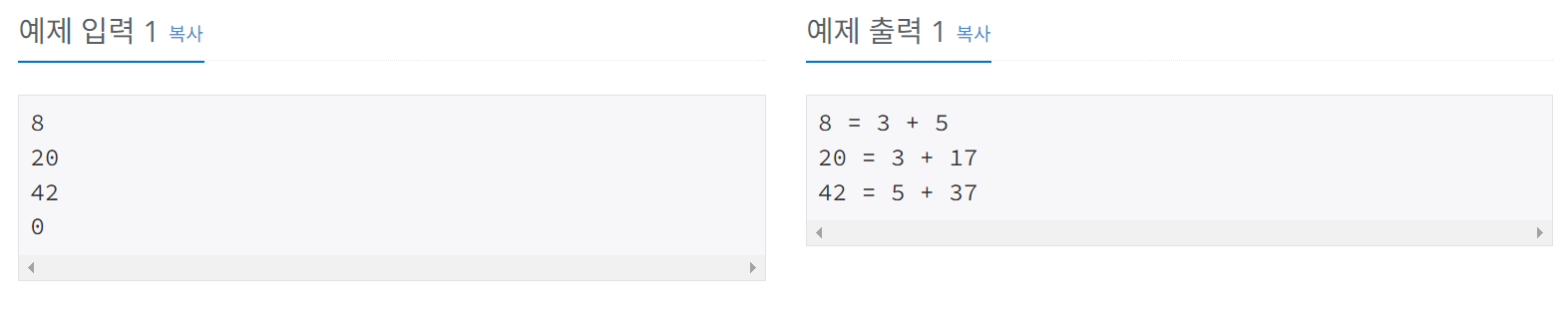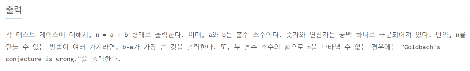 또한 소수 만으로 만들 수 없을 때 "Goldbach's conjecture is wrong." 을 출력하도록 해야합니다.
