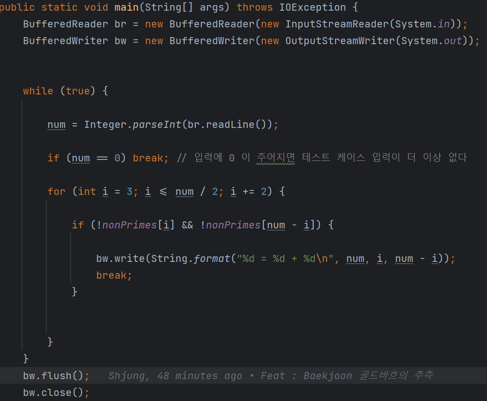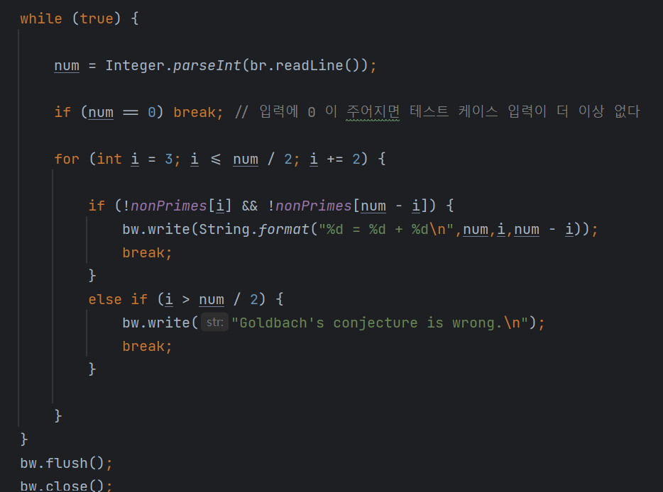 if(!nonPrimes[i] && !nonPrimes[num - i]) : i가 소수이면서 num - i 또한 소수인 수가 있는지 확인합니다.