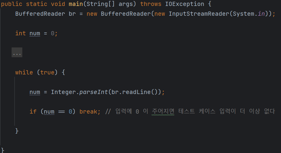if (num == 0) break; // 입력에 0 이 주어지면 테스트 케이스 입력이 더 이상 없다