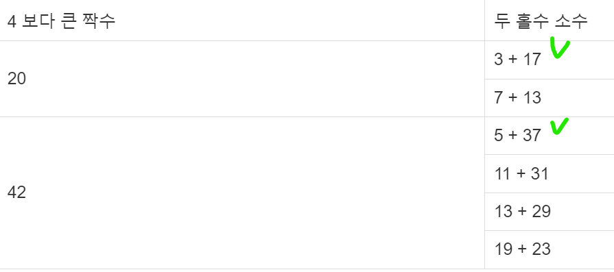 | 4 보다 큰 짝수 | 두 홀수 소수 |
