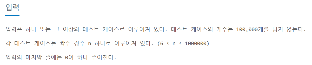 입력으로는 6 이상, 1,000,000 이하 짝수 정수가 주어진다 합니다.