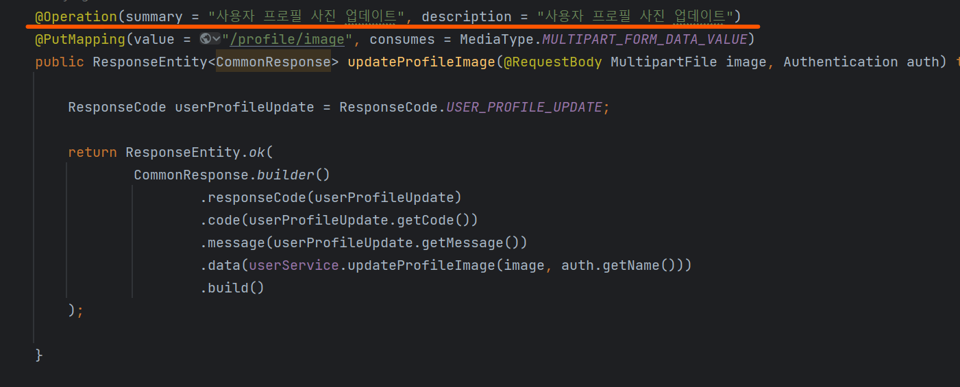 위와 같이 controller에 @Operation 어노테이션을 추가하고 , summary와 description을 이용해 api에 대한 설명을 덧붙여 주면 됩니다!