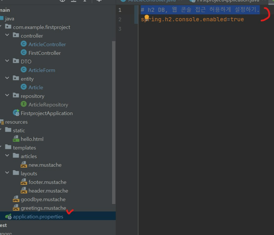 h2를 사용하기 위해 웹 콘솔접근을 허용해야합니다. 기본값이 false 였던 설정을 true 로 변경하겠습니다.