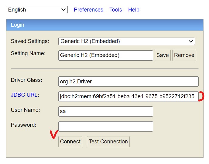 JDBC URL에 jdbc:h2:mem:testdb를 입력하고 connect를 해줍니다.